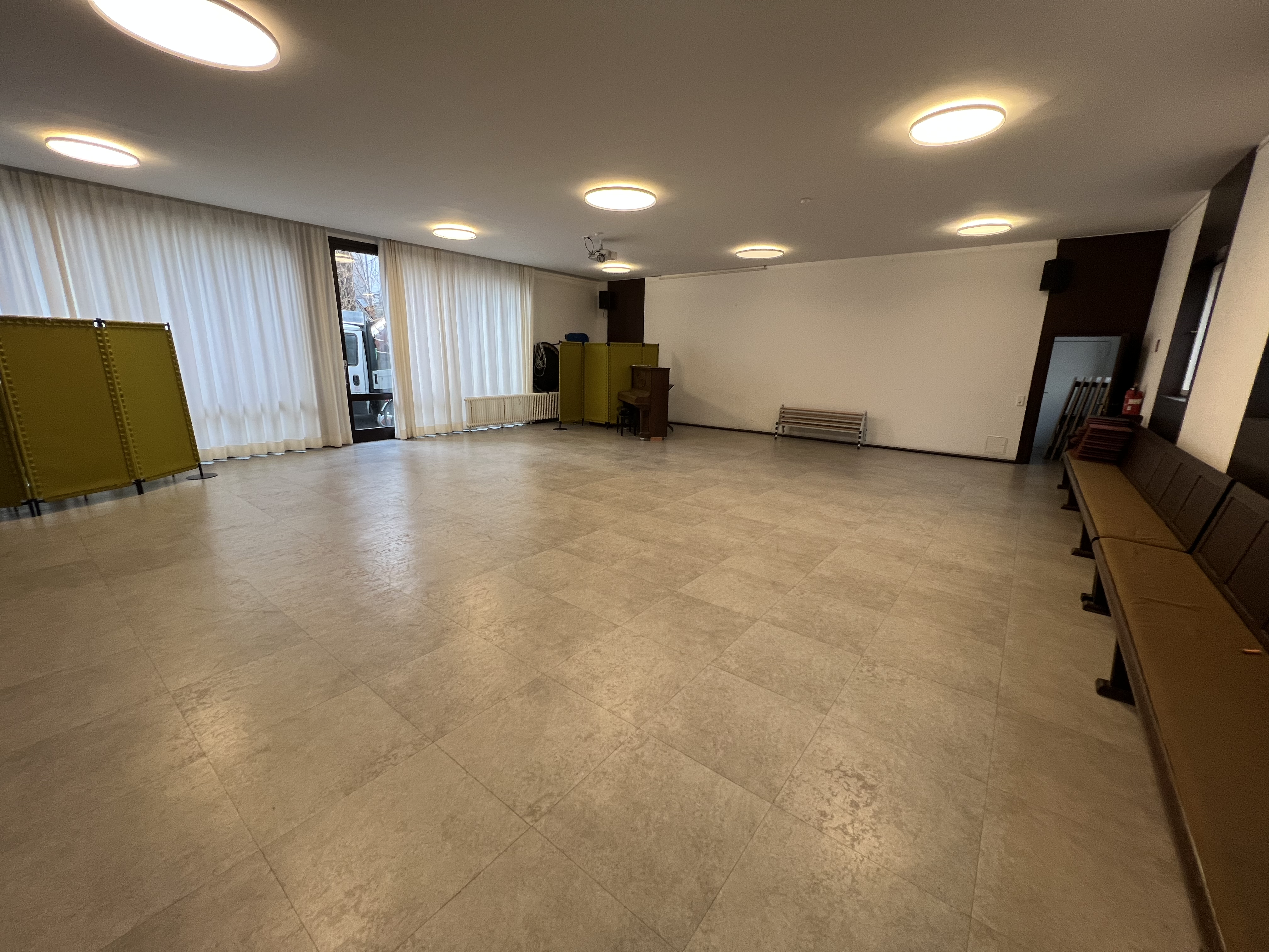 Der Gemeindesaal ist unser großer, vielseitiger Veranstaltungsraum mit direktem Zugang über die Mathildenstraße. Helle Fenster zum Hof, ebenerdiger Zugang, gute Technik und eine Küche machen ihn ideal für Feiern, Workshops, Kurse und Gemeindeveranstaltungen.