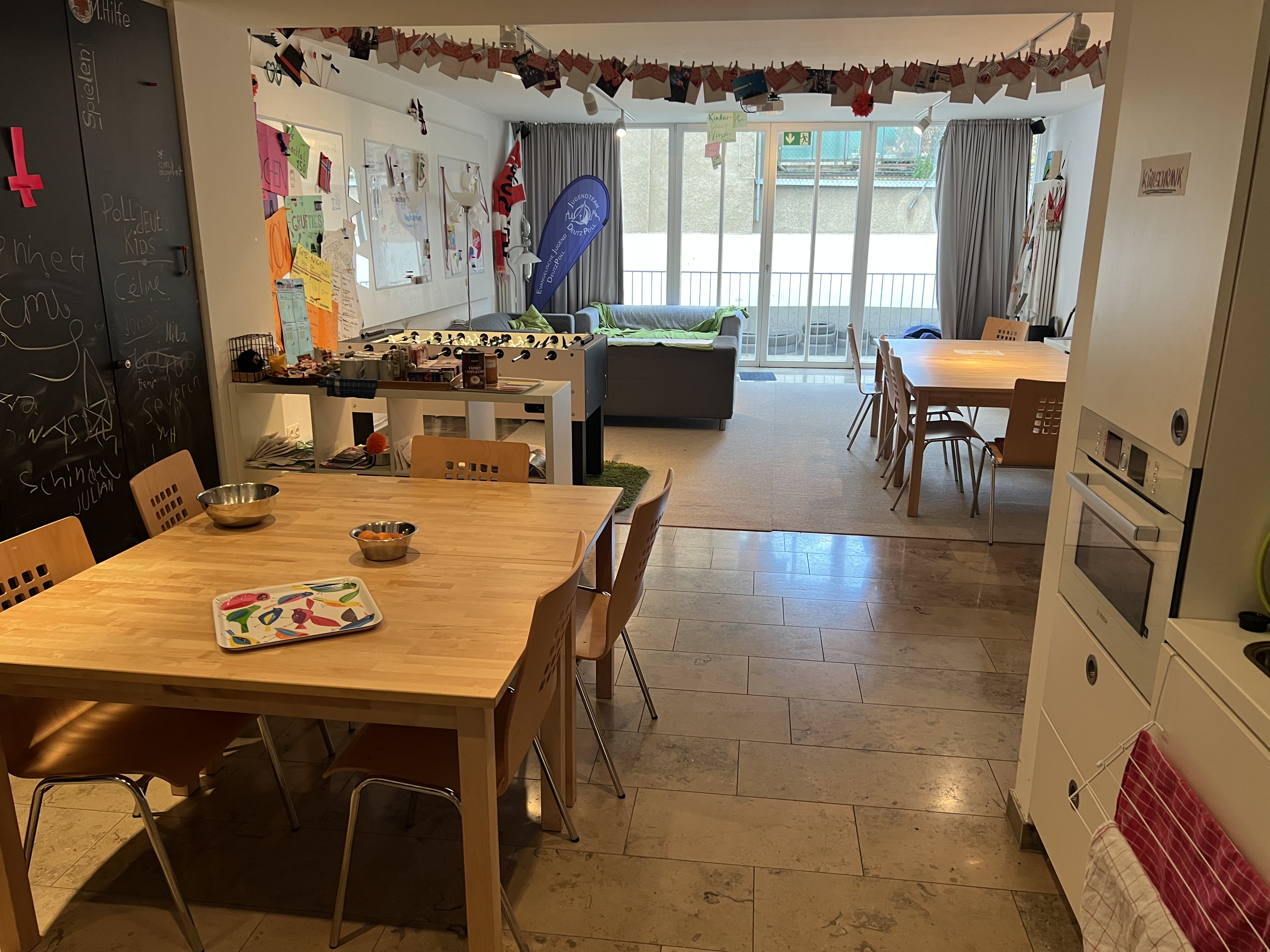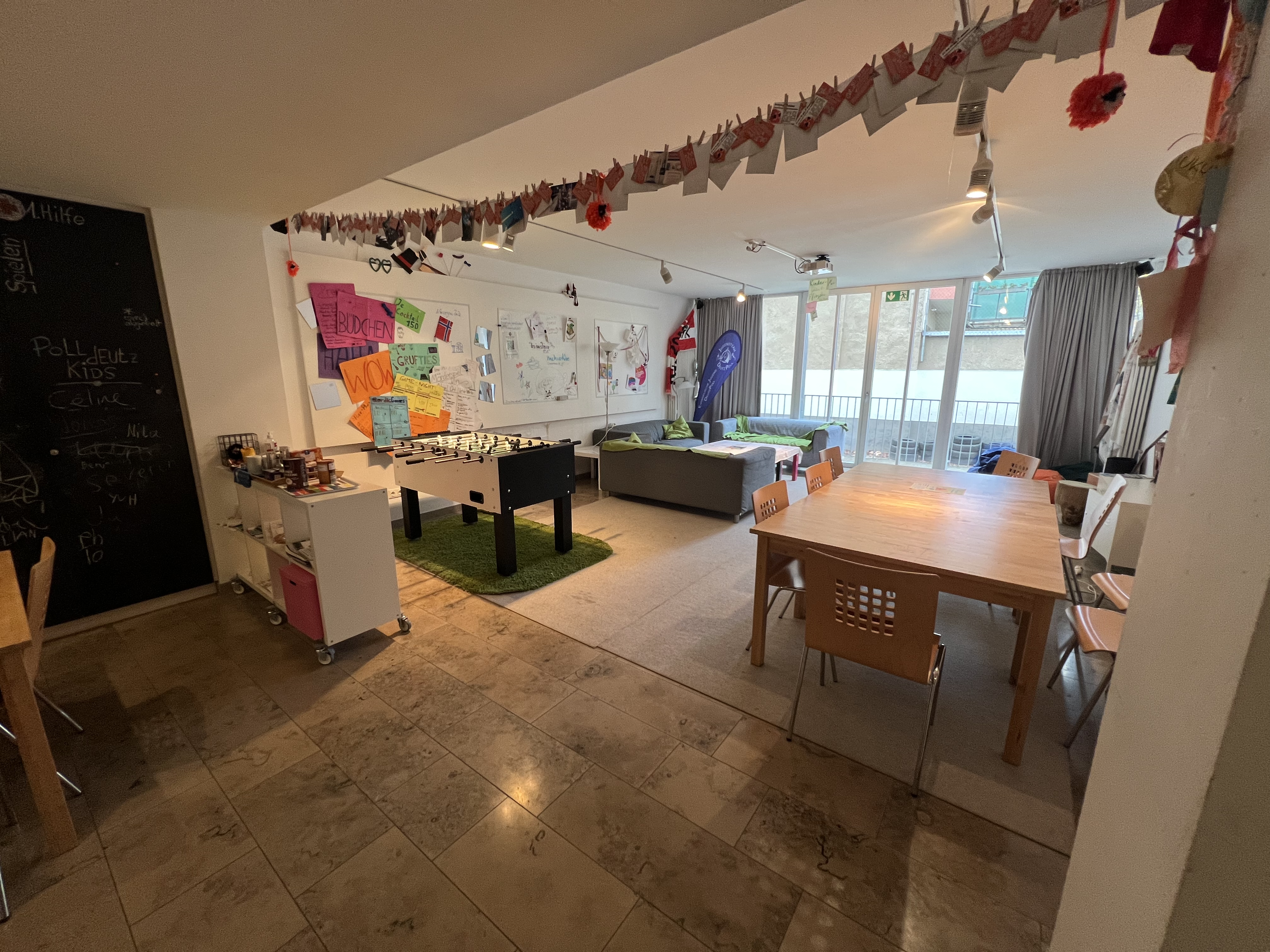 Der Jugendraum ist gemütlich, locker und bewusst unkompliziert gestaltet: Sofa-Bereiche, weiches Licht, Raum zum Sitzen, Liegen, Spielen und bei Bedarf zum gemeinsamen Essen. Perfekt für entspannte Gruppenabende oder Treffen mit Freund*innen.