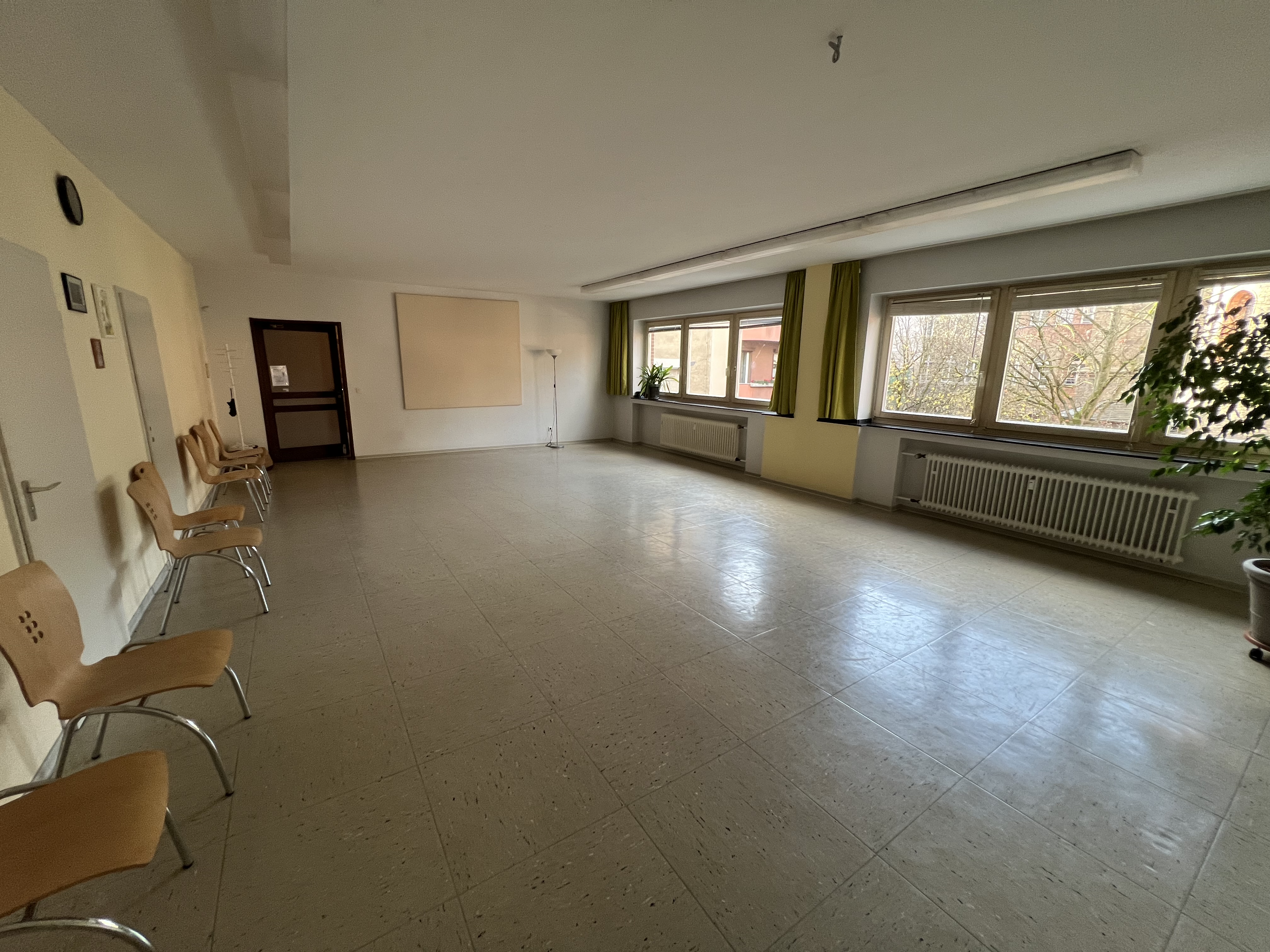 Der Seminarraum ist über die Mathildenstraße erreichbar. Er liegt nicht auf der gleichen Straße wie die Kirche sondern im Block dahinter.