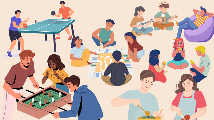 Quatschen, Spielen (analog oder digital) Kickern, Tischtennis, Teamplanungen und Absprachen, Musik machen