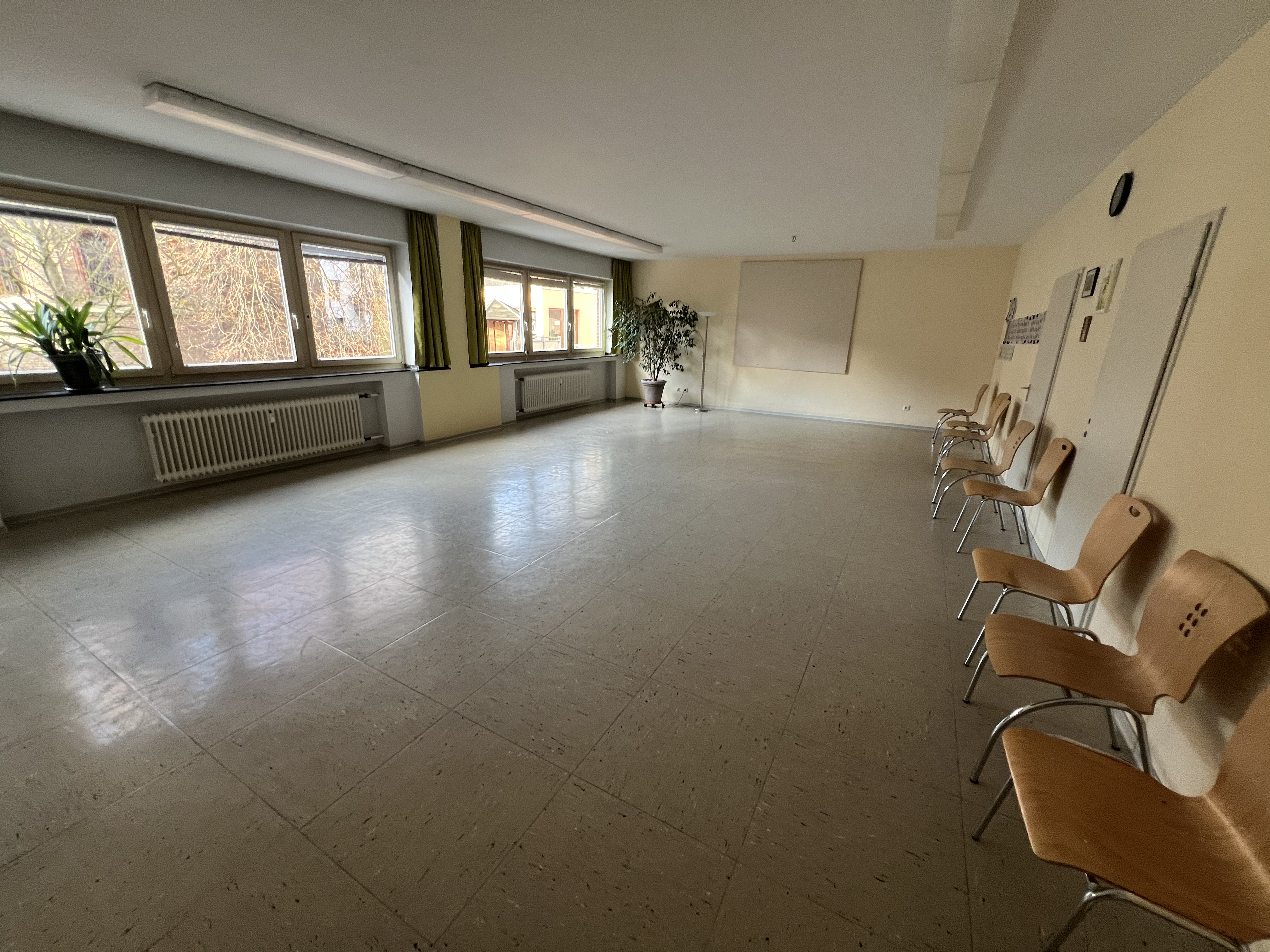 Der Seminarraum ist über die Mathildenstraße erreichbar. Er liegt nicht auf der gleichen Straße wie die Kirche sondern im Block dahinter.